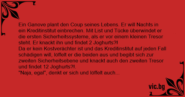 Ein Ganove plant den Coup seines Lebens. Er will Nachts in ein Kreditinstitut einbrechen. Mit List und Tücke überwindet er die ersten Sicherheitssysteme, als er vor einem kleinen Tresor steht. Er knackt ihn und findet 2 Joghurts?!