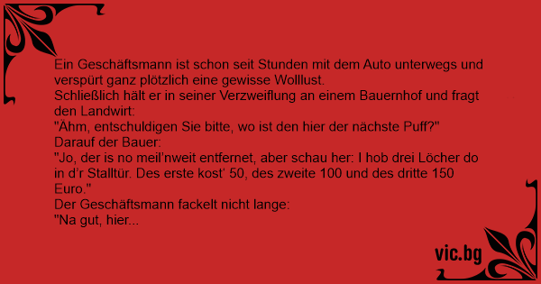 - "Des war mei 60z’g jährige Öide." erklärt der Bauer. "Hm, na gut. Dann nehme ich jetzt das zweite Loch." Er bezahlt, geht hin und kommt schließlich völlig geschafft wieder. "Oh, das war noch geiler!"