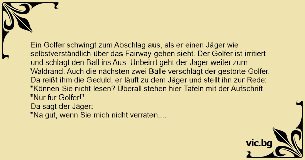 Ein Golfer schwingt zum Abschlag aus, als er einen Jäger wie selbstverständlich über das Fairway gehen sieht. Der Golfer ist irritiert und schlägt den Ball ins Aus. Unbeirrt geht der Jäger weiter zum Waldrand. Auch die nächsten zwei Bälle verschlägt der gestörte Golfer.