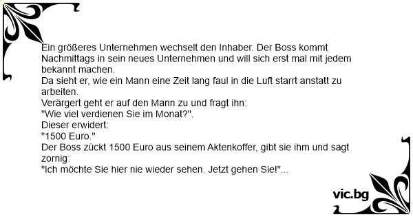 Der Boss zückt 1500 Euro aus seinem Aktenkoffer, gibt sie ihm und sagt zornig: