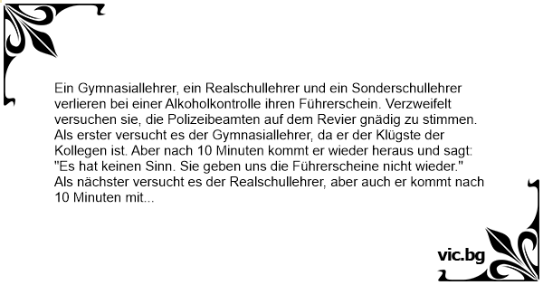 Ein Gymnasiallehrer, ein Realschullehrer und ein Sonderschullehrer verlieren bei einer Alkoholkontrolle ihren Führerschein. Verzweifelt versuchen sie, die Polizeibeamten auf dem Revier gnädig zu stimmen.