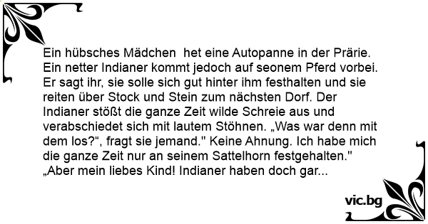 Ein hübsches Mädchen het eine Autopanne in der Prärie. Ein netter Indianer kommt jedoch auf seonem Pferd vorbei. Er sagt ihr, sie solle sich gut hinter ihm festhalten und sie reiten über Stock und Stein zum nächsten Dorf. Der Indianer stößt die ganze Zeit wilde Schreie aus und verabschiedet sich mit lautem Stöhnen. „Was war denn mit dem los?“, fragt sie jemand." Keine Ahnung. Ich habe mich die ganze Zeit nur an seinem Sattelhorn festgehalten." „Aber mein liebes Kind! Indianer haben doch gar keine Sättel.“