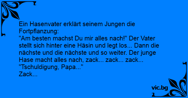 "Am besten machst Du mir alles nach!" Der Vater stellt sich hinter eine Häsin und legt los... Dann die nächste und die nächste und so weiter. Der junge Hase macht alles nach, zack... zack... zack... "Tschuldigung, Papa..."
