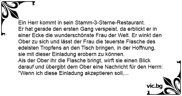 Er hat gerade den ersten Gang verspeist, da erblickt er in einer Ecke die wunderschönste Frau der Welt. Er winkt den Ober zu sich und lässt der Frau die teuerste Flasche des edelsten Tropfens an den Tisch bringen, in der Hoffnung, sie mit dieser Einladung erobern zu können.