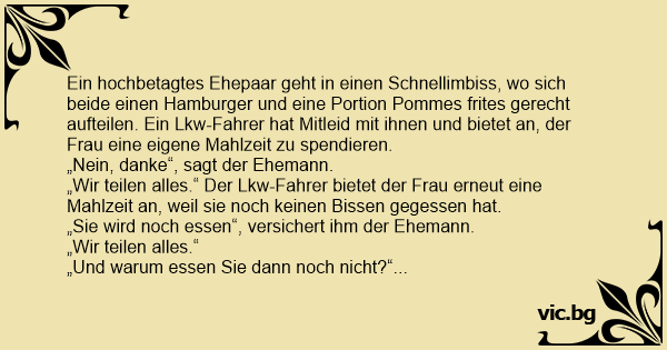 Vanha pariskunta meni pikaruokalaan ja jakoi puoliksi hampurilaisen ja ranskalaiset. Muuan rekkamies sääli vanhaa paria ja tarjoutui ostamaan molemmille oman aterian. ”Ei hätää”, aviomies sanoi....