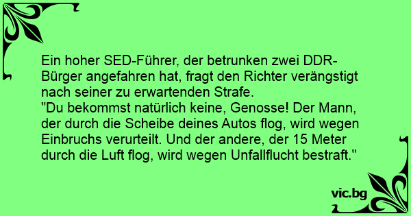 "Du bekommst natürlich keine, Genosse! Der Mann, der durch die Scheibe deines Autos flog, wird wegen Einbruchs verurteilt. Und der andere, der 15 Meter durch die Luft flog, wird wegen Unfallflucht bestraft."