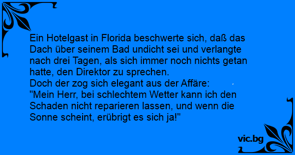 Ein Hotelgast in Florida beschwerte sich, daß das Dach über seinem Bad undicht sei und verlangte nach drei Tagen, als sich immer noch nichts getan hatte, den Direktor zu sprechen.