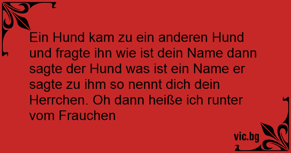Ein Hund kam zu ein anderen Hund und fragte ihn wie ist dein Name dann sagte der Hund was ist ein Name er sagte zu ihm so nennt dich dein Herrchen. Oh dann heiße ich runter vom Frauchen