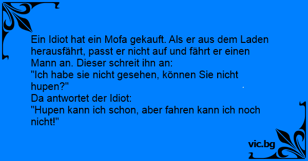 Ein Idiот hat ein Mofa gekauft. Als er aus dem Laden herausfährt, passt er niсhт auf und fährt er einen Mann an. Dieser schreit ihn an:
