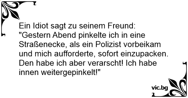 "Gestern Abend pinkelte ich in eine Straßenecke, als ein Polizist vorbeikam und mich aufforderte, sofort einzupacken. Den habe ich aber verarscht! Ich habe innen weitergepinkelt!"