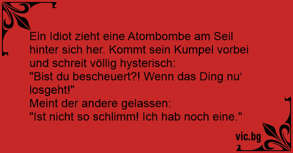 Ein Idiот zieht eine Atombombe am Seil hinter sich her. Kommt sein Kumpel vorbei und schreit völlig hysterisch: