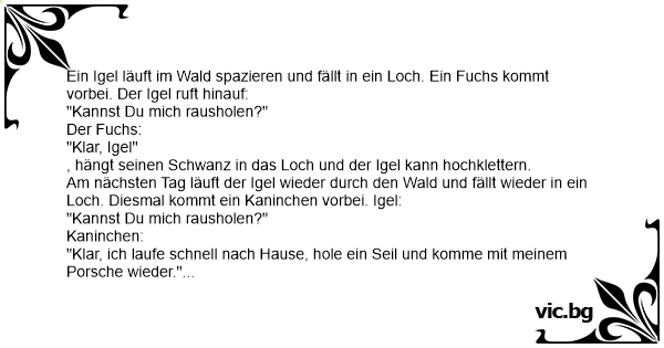 Ein Igel läuft im Wald spazieren und fällt in ein Loch. Ein Fuchs kommt vorbei. Der Igel ruft hinauf: