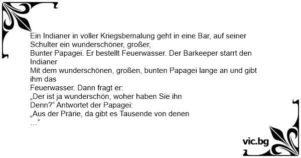 Ein Indianer in voller Kriegsbemalung geht in eine Bar, auf seiner Schulter ein wunderschöner, großer,