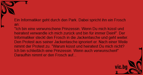 Ein Informatiker findet im Wald einen sprechenden Frosch und steckt ihn in die Tasche. Nach einer Weile sagt der Frosch: „Hallo, ich bin eine verzauberte Prinzessin. Wenn du mich küsst, erfülle ich...