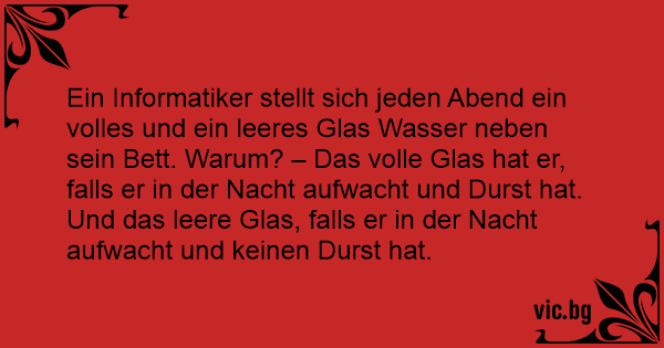 Ein Informatiker stellt sich jeden Abend ein volles und ein leeres Glas Wasser neben sein Bett. Warum? – Das volle Glas hat er, falls er in der Nacht aufwacht und Durst hat. Und das leere Glas, falls er in der Nacht aufwacht und keinen Durst hat.