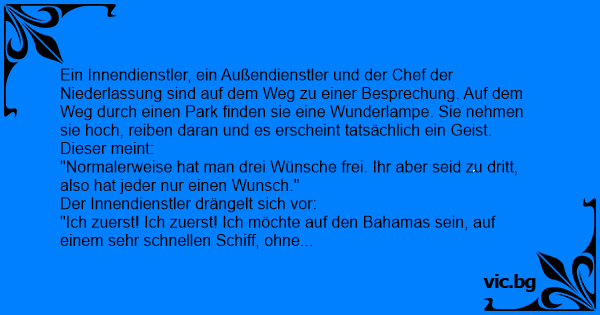 Ein Innendienstler, ein Außendienstler und der Chef der Niederlassung sind auf dem Weg zu einer Besprechung. Auf dem Weg durch einen Park finden sie eine Wunderlampe. Sie nehmen sie hoch, reiben daran und es erscheint tatsächlich ein Geist. Dieser meint: