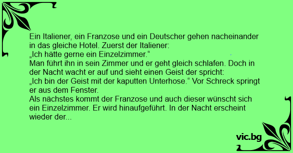 Danach geht der Deutsche in das Hotel und bestellt sich ein Einzelzimmer. Auch der Deutsche wird in das Zimmer geführt. Der Geist erscheint erneut. „Ich bin der Geist mit der kaputten Unterhose“, heult er. „Ach Gott, hier hast du 10 Euro kauf dir eine neue“, erwidert der Deutsche.