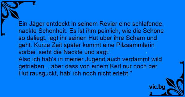 Ein Jäger entdeckt in seinem Revier eine schlafende, nackte Schönheit. Es ist ihm peinlich, wie die Schöne so daliegt, legt ihr seinen Hut über ihre Scham und geht. Kurze Zeit später kommt eine Pilzsammlerin vorbei, sieht die Nackte und sagt:
