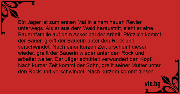 Ein Jäger ist zum ersten Mal in einem neuen Revier unterwegs. Als er aus dem Wald heraustritt, sieht er eine Bauernfamilie auf dem Acker bei der Arbeit. Plötzlich kommt der Bauer, greift der Bäuerin unter den Rock und verschwindet. Nach einer kurzen Zeit erscheint dieser wieder, greift der Bäuerin wieder unter den Rock und arbeitet weiter. Der Jäger schüttelt verwundert den Kopf. Nach kurzer Zeit kommt der Sohn, greift seiner Mutter unter den Rock und verschwindet. Nach kurzem kommt dieser wieder, greift wieder unter den Rock der Bäuerin und arbeitet weiter. Als dann auch noch dasselbe mit der Tochter geschieht, kann sich der Jäger niсhт zurückhalten, geht zum Bauer und sagt: