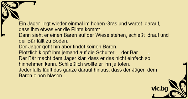 Der Jäger liegt also wieder im Gras, der Bär kommt vorbei, der Jäger schießt aus allen Rohren ... der Bär fällt zu Boden. Der Jäger rennt voller Freude vor aber wieder kein Bär da. Er spürt, dass ihm jemand auf die Schulter klopft ... wieder muss er dem Bären einen blasen.