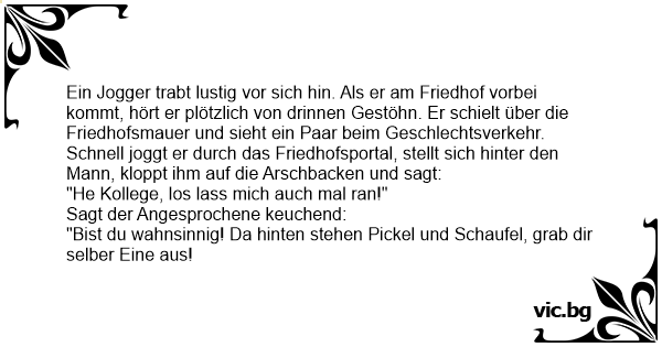 Ein Jogger trabt lustig vor sich hin. Als er am Friedhof vorbei kommt, hört er plötzlich von drinnen Gestöhn. Er schielt über die Friedhofsmauer und sieht ein Paar beim Geschlechtsverkehr. Schnell joggt er durch das Friedhofsportal, stellt sich hinter den Mann, kloppt ihm auf die Arschbacken und sagt: