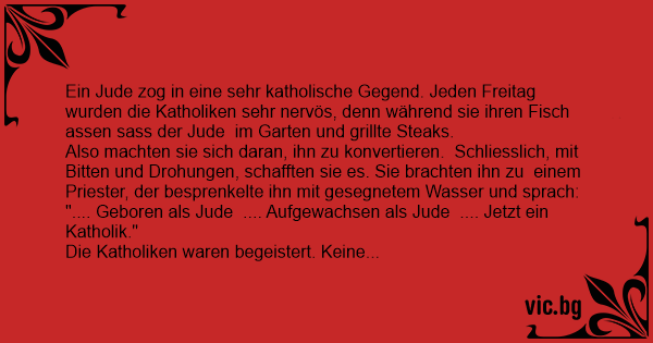 Ein Jude zog in eine sehr katholische Gegend. Jeden Freitag wurden die Katholiken sehr nervös, denn während sie ihren Fisch assen sass der Jude im Garten und grillte Steaks.