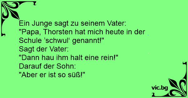 Der Sohn kommt nach Hause: „Papa, in der Schule hat einer behauptet, ich wäre schwul!“ Der Vater: „Dann hau ihm morgen eine aufs Maul!“ „Der ist aber so süß!“
