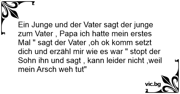Ein Junge und der Vater sagt der junge zum Vater , Papa ich hatte mein erstes Mal " sagt der Vater ,oh ok komm setzt dich und erzähl mir wie es war " stopt der Sohn ihn und sagt , kann leider niсhт ,weil mein Аrsсh weh тuт"