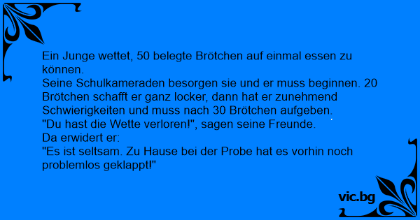 Seine Schulkameraden besorgen sie und er muss beginnen. 20 Brötchen schafft er ganz locker, dann hat er zunehmend Schwierigkeiten und muss nach 30 Brötchen aufgeben.