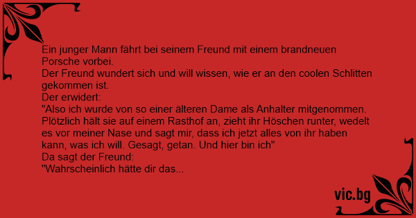 "Also ich wurde von so einer älteren Dame als Anhalter mitgenommen. Plötzlich hält sie auf einem Rasthof an, zieht ihr Höschen runter, wedelt es vor meiner Nase und sagt mir, dass ich jetzt alles von ihr haben kann, was ich will. Gesagt, getan. Und hier bin ich"