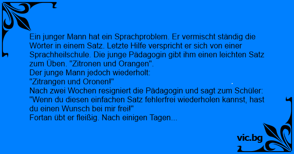 Ein junger Mann hat ein Sprachproblem. Er vermischt ständig die Wörter in einem Satz. Letzte Hilfe verspricht er sich von einer Sprachheilschule. Die junge Pädagogin gibt ihm einen leichten Satz zum Üben. "Zitronen und Orangen".