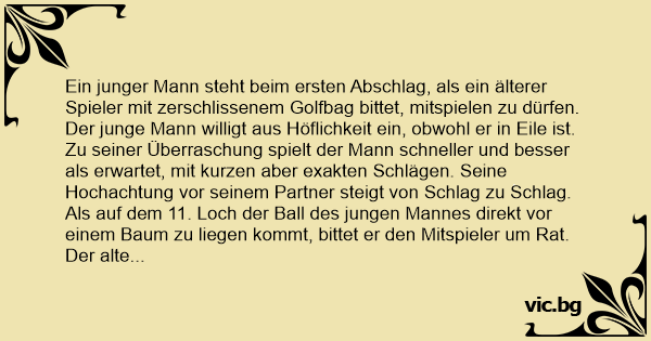 Ein junger Mann steht beim ersten Abschlag, als ein älterer Spieler mit zerschlissenem Golfbag bittet, mitspielen zu dürfen. Der junge Mann willigt aus Höflichkeit ein, obwohl er in Eile ist. Zu seiner Überraschung spielt der Mann schneller und besser als erwartet, mit kurzen aber exakten Schlägen. Seine Hochachtung vor seinem Partner steigt von Schlag zu Schlag.