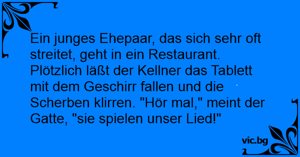 Ein junges Ehepaar, das sich sehr oft streitet, geht in ein Restaurant. Plötzlich läßt der Kellner das Tablett mit dem Geschirr fallen und die Scherben klirren. "Hör mal," meint der Gatte, "sie spielen unser Lied!"