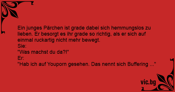 Баферинг С гаджето правихме сeкс вчера, когато изведнъж спрях по средата на всичко и застанах ужасно неподвижен. Lui e lei fanno l'amore. All'improvviso lui si ferma è rimane come congelato. Lei lo guarda stupefatta e chiede: - Ma sei normale, cosa stai facendo? - Cara, questo è il nuovissimo trend nei film porno su Internet – si chiama buffering. My 1st time having sex. I suddenly stopped and didn't move. She: "What are you doing?" Me: "I've seen this on YouPorn, it's called Buffering. Een echtpaar ligt in bed de liefde te bedrijven. Na een paar standjes begint de man schokkend te bewegen en houdt zich, tijdens de voorwaartse beweging, ineens helemaal stijf als een standbeeld....