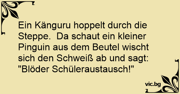 Australien. Mama Känguru hüpft durch die Steppe. Aus ihrem Beutel guckt ein Pinguin, verdreht die Augen und stöhnt: "Blöder Schüleraustausch!"