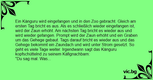 Ein Känguru wird eingefangen und in den Zoo gebracht. Gleich am ersten Tag bricht es aus. Als es schließlich wieder eingefangen ist, wird der Zaun erhöht. Am nächsten Tag bricht es wieder aus und wird wieder gefangen. Prompt wird der Zaun erhöht und ein Graben um das Gehege gebaut. Tags darauf bricht es wieder aus und das Gehege bekommt ein Zaundach und wird unter Strom gesetzt. So geht es viele Tage weiter. Irgendwann sagt das Känguru kopfschüttelnd zu seinem Käfignachbarn: