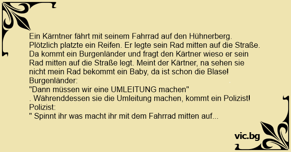 Plötzlich platzte ein Reifen. Er legte sein Rad mitten auf die Straße. Da kommt ein Burgenländer und fragt den Kärtner wieso er sein Rad mitten auf die Straße legt. Meint der Kärtner, na sehen sie niсhт mein Rad bekommt ein Baby, da ist schon die Blase! Burgenländer: