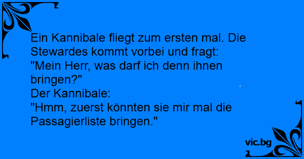 Kannibalen var på flytur. Etter en stund kom flyvertinnen bort til ham og spurte: – Har De lyst til å se menyen? Da svarte kannibalen: – Nei takk, men jeg vil gjerne se passasjerlisten.