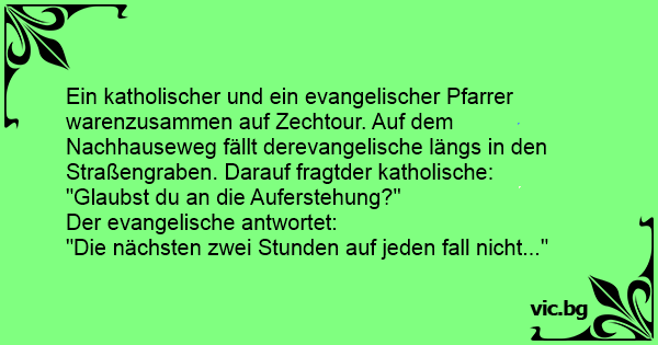 Ein katholischer und ein evangelischer Pfarrer warenzusammen auf Zechtour. Auf dem Nachhauseweg fällt derevangelische längs in den Straßengraben. Darauf fragtder katholische: