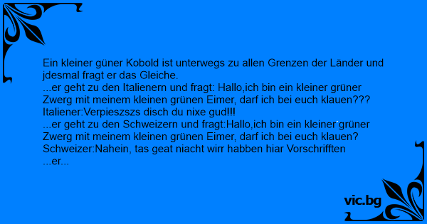 ...er geht zu den Schweizern und fragt:Hallo,ich bin ein kleiner grüner Zwerg mit meinem kleinen grünen Eimer, darf ich bei euch klauen? Schweizer:Nahein, tas geat niacht wirr habben hiar Vorschrifften