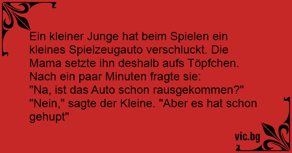 Ein kleiner Junge hat beim Spielen ein kleines Spielzeugauto verschluckt. Die Mama setzte ihn deshalb aufs Töpfchen. Nach ein paar Minuten fragte sie: