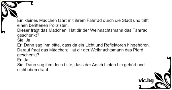 Fritzchen hat ein neues Fahrrad zu Weihnachten bekommen und steht damit nun an der Ampel. Da kommt ein berittener Polizist vorbei und fragt Fritzchen: „Na, hast du das Fahrrad zu Weihnachten...