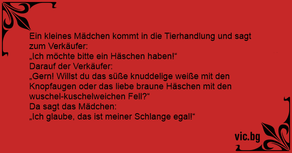 Das Kaninchen Малко момиченце в зоомагазин: A precious little girl walks into a pet shop and asks in the sweetest little lisp, "Excuthe me, mithter, do you keep widdle wabbits?" Kommt ein kleines Mädchen in ein Zoogeschäft und sagt: "Ich hätte gern ein Kaninchen". Der Verkäufer sagt: "Möchtest du denn das kleine braune mit den niedlichen Knopfaugen oder das kuschelige... Een klein meisje gaat naar een dierenwinkel en vraagt aan de verkoper: "Heeft u soms een konijntje a.u.b.?" De verkoper zet zich op zijn knieën en vraagt: "Moet dat een lief klein bruin konijntje... Una ragazzina entra in un negozio di animali domestici. La commessa: “Ciao, che cosa posso fare per te?” La ragazzina: “Vorrei un coniglietto!” “Di che colore lo vuoi, cara? Bianco, nero, marrone?”...