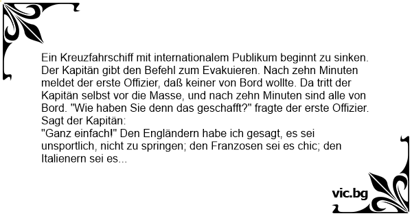 Ein Kreuzfahrschiff mit internationalem Publikum beginnt zu sinken. Der Kapitän gibt den Befehl zum Evakuieren. Nach zehn Minuten meldet der erste Offizier, daß keiner von Bord wollte. Da tritt der Kapitän selbst vor die Masse, und nach zehn Minuten sind alle von Bord. "Wie haben Sie denn das geschafft?" fragte der erste Offizier.