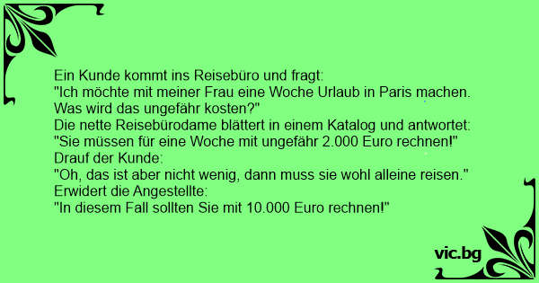 "Ich möchte mit meiner Frau eine Woche Urlaub in Paris machen. Was wird das ungefähr kosten?"