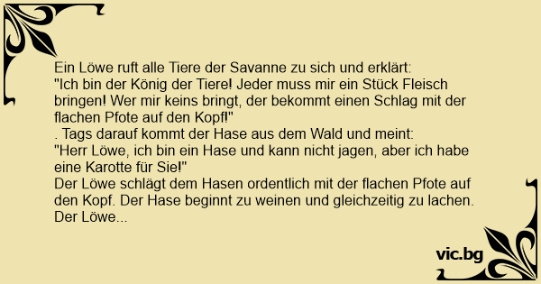 "Herr Löwe, ich bin ein Hase und kann niсhт jagen, aber ich habe eine Karotte für Sie!"