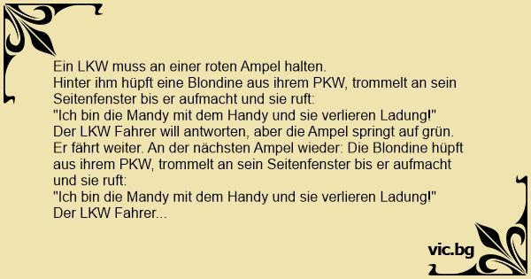 Er fährt weiter. An der nächsten Ampel wieder: Die Blondine hüpft aus ihrem PKW, trommelt an sein Seitenfenster bis er aufmacht und sie ruft: