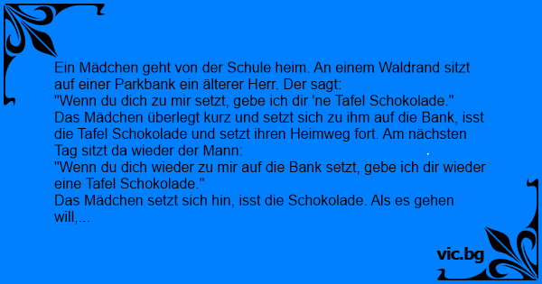 Das Mädchen überlegt kurz und setzt sich zu ihm auf die Bank, isst die Tafel Schokolade und setzt ihren Heimweg fort. Am nächsten Tag sitzt da wieder der Mann:
