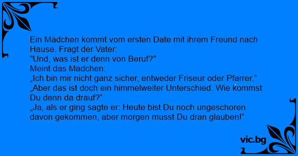 Ein Mädchen kommt vom ersten Date mit ihrem Freund nach Hause. Fragt der Vater:
