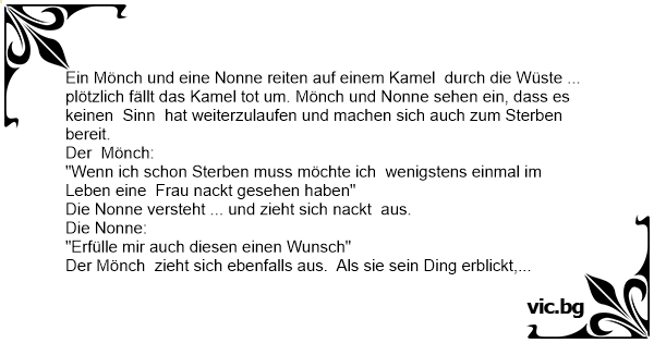 Ein Mönch und eine Nonne reiten auf einem Kamel durch die Wüste. Plötzlich bricht das Tier tot zusammen. Nach mehreren Tagen sind Mönch und Nonne dem Tode nah. Der Mönch sagt: "Schwester, ich...
